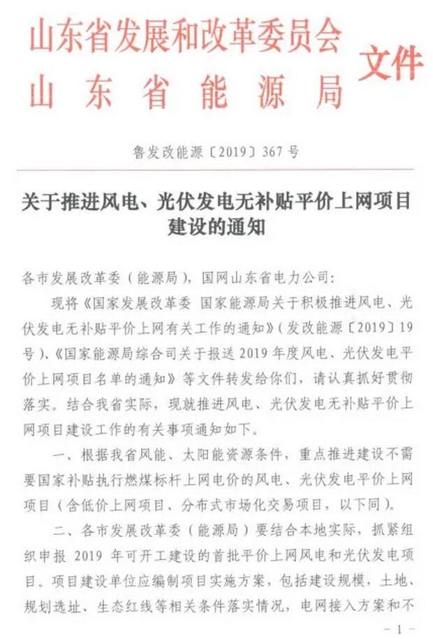 4月18日,山東省發(fā)展和改革委員會和山東省能源局聯(lián)合印發(fā)《關(guān)于推進(jìn)風(fēng)電、光伏發(fā)電無補(bǔ)貼平價(jià)上網(wǎng)項(xiàng)目建設(shè)的通知》。