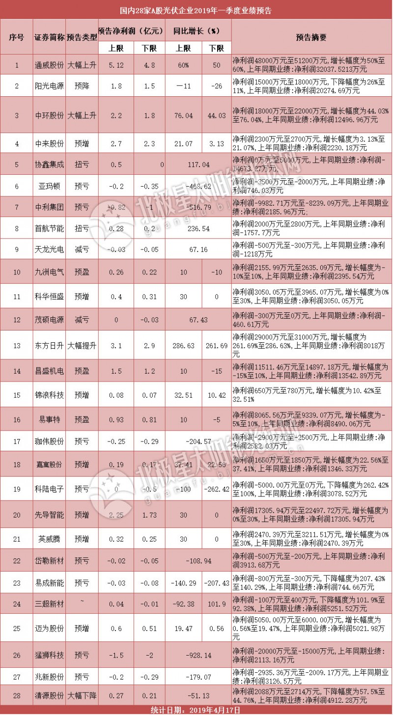28家A股光伏企業(yè)2019年一季度業(yè)績(jī)預(yù)告