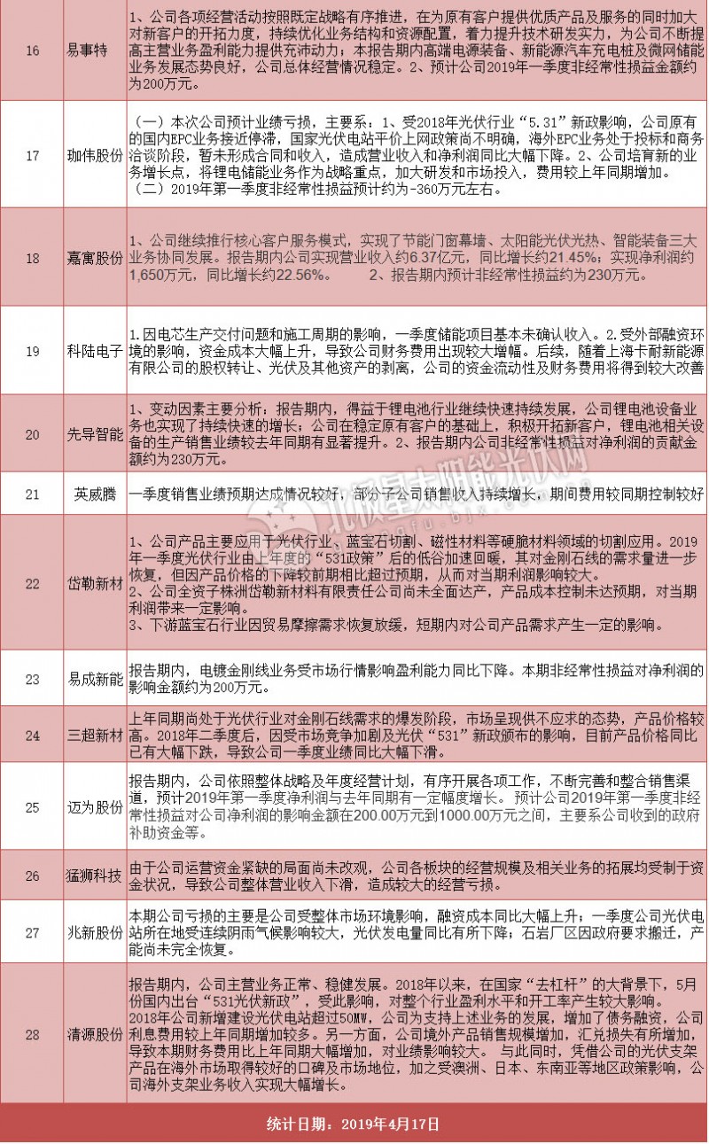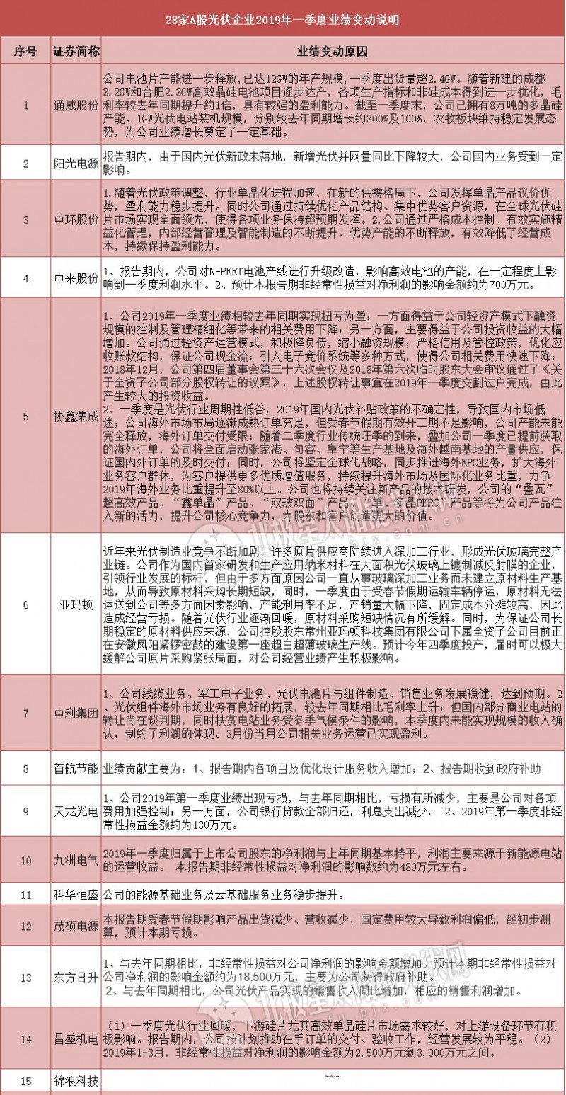 28家A股光伏企業(yè)2019年一季度業(yè)績(jī)變動(dòng)說(shuō)明