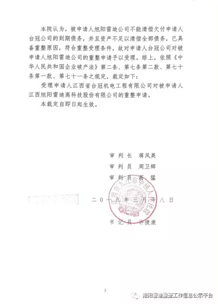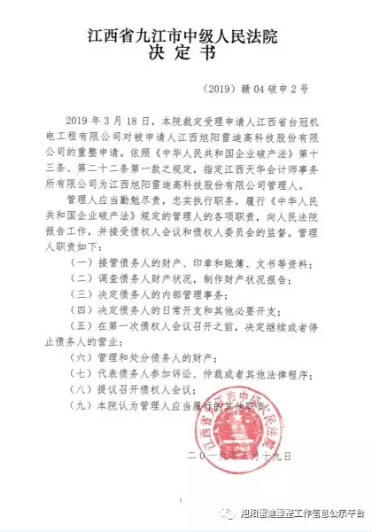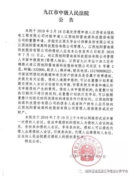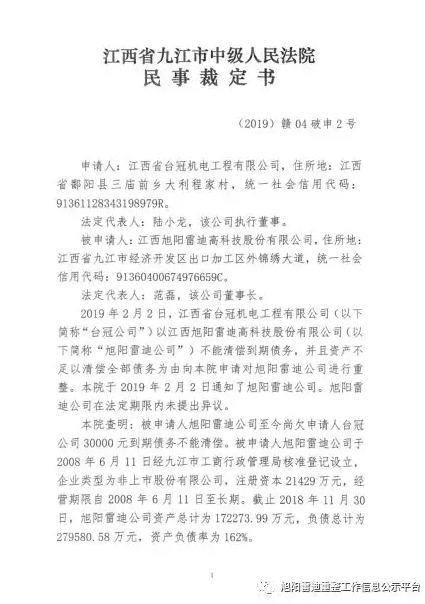 江西旭陽雷迪進(jìn)入破產(chǎn)重整程序