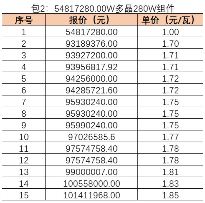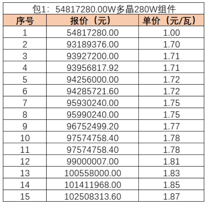 該項目組件交貨期為2019年7月-9月。據(jù)了解,其中,由湖南紅太陽報出的最低價1元/瓦因信息填寫錯誤已廢標。去除該無效報價后,最低報價1.70元/瓦,最高報價1.87元/瓦,均價在1.76元/瓦左右。該價格為人民幣含稅價。