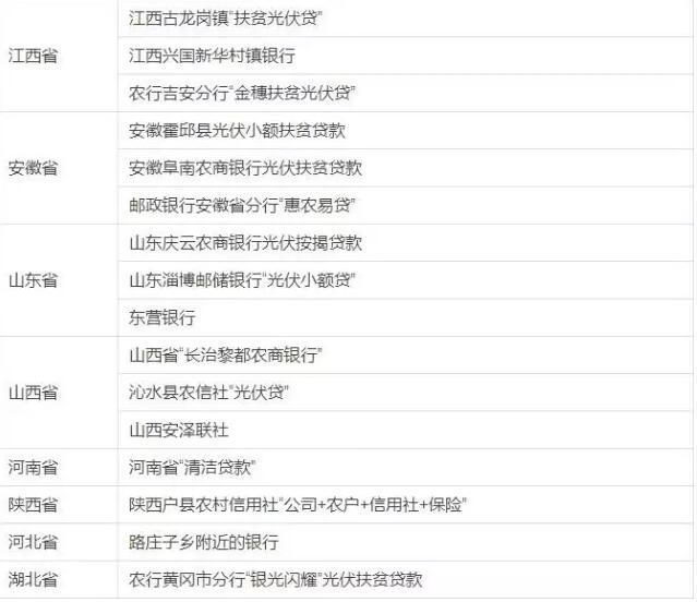 目前光伏貸款各地都有所涉及如,江蘇銀行“光伏貸”、上海市“陽光貸”、浙江諸暨農(nóng)商銀行 “光伏貸“、臨安信用社“光伏貸”、龍游農(nóng)信聯(lián)社湖鎮(zhèn)信用社、河南省“清潔貸款“、安徽霍邱縣 光伏小額扶貧貸款等。