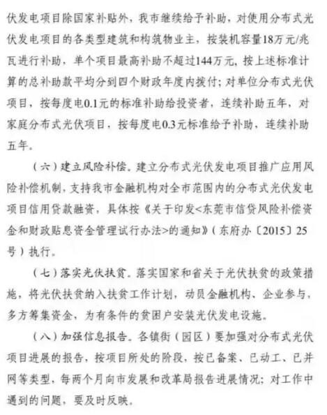 2017年至2018年,東莞備案并完成裝機并網(wǎng)的分布式光伏項目享受以下補貼:一次性裝機補助部分每兆瓦18萬元,并平均到4個財政年度撥付,每個項目最高補助144萬元;發(fā)電補助部分企業(yè)投資項目0.1元/千瓦時,個人投資項目0.3元/千瓦時,連續(xù)補助5年。