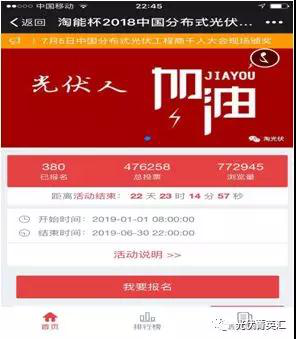 由各省市光伏協(xié)會(huì)作為指導(dǎo)單位、淘光伏主辦的淘能杯2018中國(guó)分布式光伏優(yōu)秀品牌評(píng)選活動(dòng)自2019年1月1日啟動(dòng)以來(lái),堅(jiān)持自愿申報(bào),公平、公正、公開(kāi)的原則,得到了數(shù)百家一線光伏經(jīng)銷(xiāo)商、服務(wù)商、設(shè)備商、設(shè)計(jì)院、EPC公司的大力支持和響應(yīng),大家踴躍報(bào)名,積極參與投票,爭(zhēng)相進(jìn)行品牌宣傳和產(chǎn)品推廣!