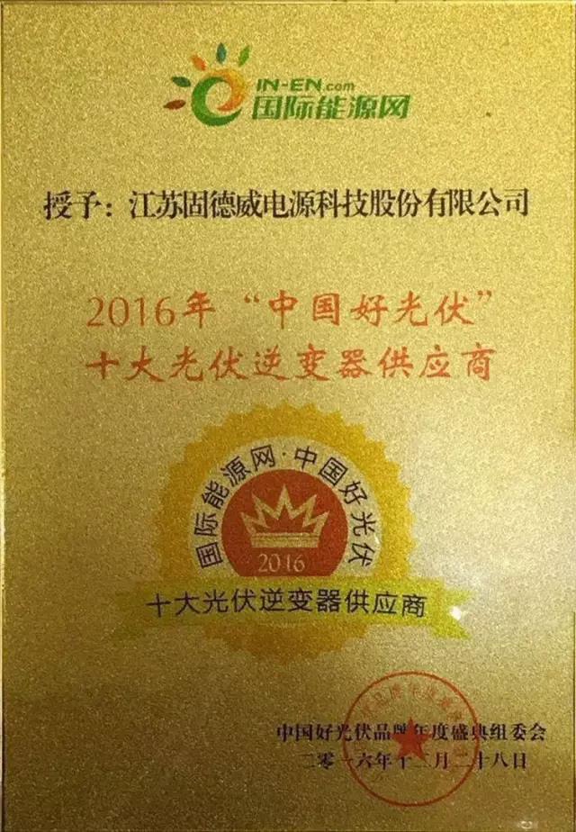 在過去的日子里,固德威依托技術(shù)研發(fā),碩果累累,先后榮獲政府列名“高新技術(shù)企業(yè)”、“省工程技術(shù)中心”、“省博士后創(chuàng)新基站”、“省研究生工作站”、光能雜志“中國十佳逆變器企業(yè)”、北極星“中國十佳逆變器品牌”、“中國十大逆變器品牌”、“SNEC兆瓦級金獎”、及“蘇州市科學(xué)技術(shù)局光伏并網(wǎng)逆變器研究中心”等榮譽稱號。
