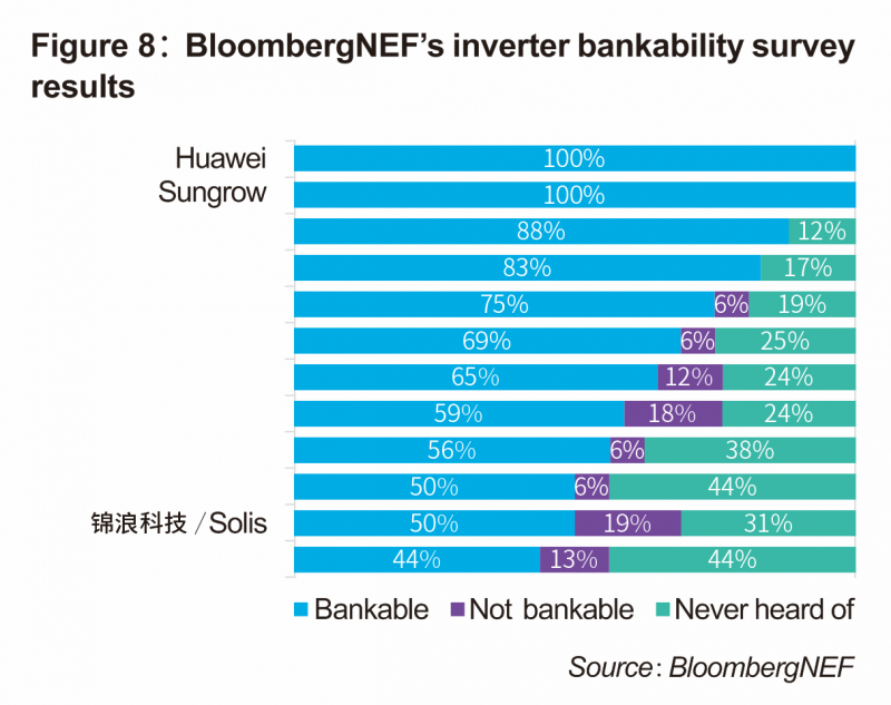 此次BNEF發(fā)布的評選報告主要針對全球知名光伏逆變器制造商的融資價值展開。他們面向全球金融機(jī)構(gòu)(銀行、基金)、項目開發(fā)商(EPC)、獨(dú)立電力生產(chǎn)運(yùn)營商等光伏行業(yè)利益相關(guān)方發(fā)出問卷調(diào)查表,并與質(zhì)量檢測和技術(shù)專家進(jìn)行深度訪談,調(diào)研范圍覆蓋全球25吉瓦的光伏產(chǎn)品。