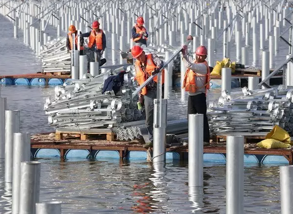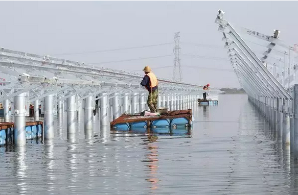 這項(xiàng)從2016年6月底進(jìn)場(chǎng)施工的浩瀚工程進(jìn)展“神速”。不到半年,一個(gè)“上可發(fā)電、下可養(yǎng)魚(yú)”的大型漁光互補(bǔ)光伏發(fā)電項(xiàng)目已基本完工。