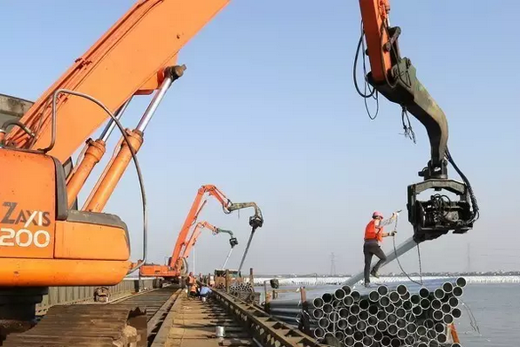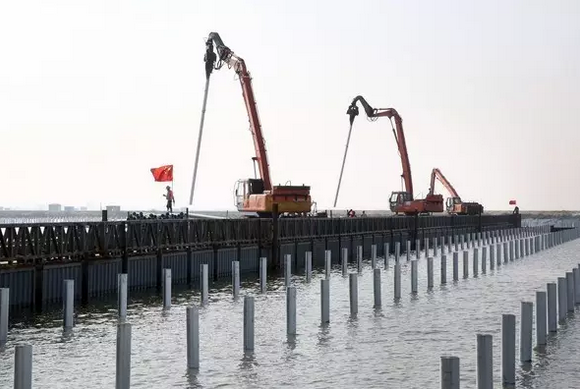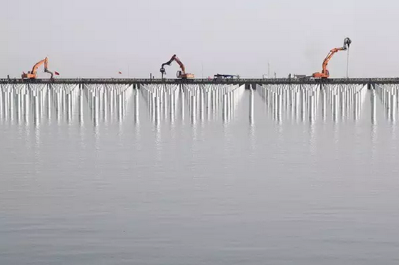記者在施工現(xiàn)場(chǎng)看到,岸邊,大型吊裝機(jī)伸展巨臂進(jìn)行吊裝作業(yè);水面上,運(yùn)送材料的船只來(lái)往穿梭;水中平臺(tái)上,大型打樁機(jī)把一根根樁管打入水底……由近及遠(yuǎn),到處是頭戴安全帽、身穿救生衣忙碌的工人。