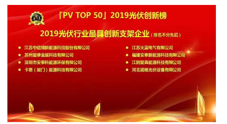 2019年11月27日,「PV TOP 50」2019光伏行業(yè)創(chuàng)新力企業(yè)50強榜單發(fā)布暨頒獎典禮(PV TOP 50光伏創(chuàng)新榜)在蘇州圓滿落下帷幕!卡思能源受邀出席,并榮獲“「PV TOP 50」2019光伏創(chuàng)新榜最具創(chuàng)新支架企業(yè)”稱號。此次獲獎是對卡思能源技術(shù)創(chuàng)新及產(chǎn)品研發(fā)能力的充分肯定。