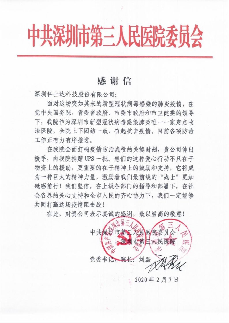 作為一家成長于深圳的企業(yè),科士達(dá)在助力全國抗疫戰(zhàn)斗,協(xié)助采購緊缺物資的同時(shí),也密切關(guān)注著深圳的疫情變化,一直與深圳市各抗疫相關(guān)部門保持著緊密聯(lián)系。了解到三院的情況之后,科士達(dá)緊急調(diào)撥UPS一批,火速馳援三院,盡己所能,全力以赴,為疫情防控貢獻(xiàn)力量。