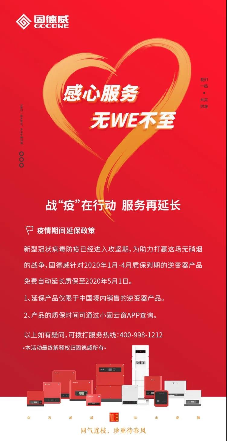 新型冠狀病毒防疫已經(jīng)進(jìn)入攻堅期,為助力打贏這場無硝煙的戰(zhàn)爭,固德威針對2020年1月-4月質(zhì)保到期的逆變器產(chǎn)品免費(fèi)自動延長質(zhì)保至2020年5月1日。