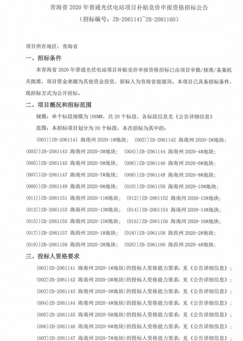 根據(jù)公告,最高投標限價按照國家發(fā)改委公布的同類資源區(qū)普通光伏電站指導電價下浮15%執(zhí)行。按照國家發(fā)改委電價文件,一二類資源區(qū)指導電價分別為0.35與0.4元/千瓦時,按照青海的招標要求,對應的最高投標價為0.2975、0.34。