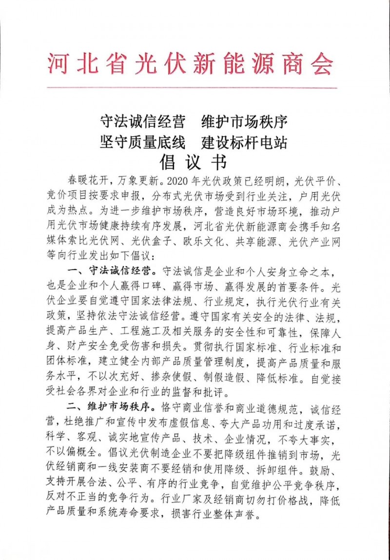 春暖花開,萬象更新。2020年光伏政策已經(jīng)明朗,光伏平價(jià)、競價(jià)項(xiàng)目按要求申報(bào),分布式光伏市場受到行業(yè)關(guān)注,戶用光伏成為熱點(diǎn)。為進(jìn)一步維護(hù)市場秩序,營造良好市場環(huán)境,推動(dòng)戶用光伏市場健康持續(xù)有序發(fā)展,河北省光伏新能源商會(huì)攜手知名媒體索比光伏網(wǎng)、光伏盒子、歐樂文化、共享能源、光伏產(chǎn)業(yè)網(wǎng)等向行業(yè)發(fā)出如下倡議: