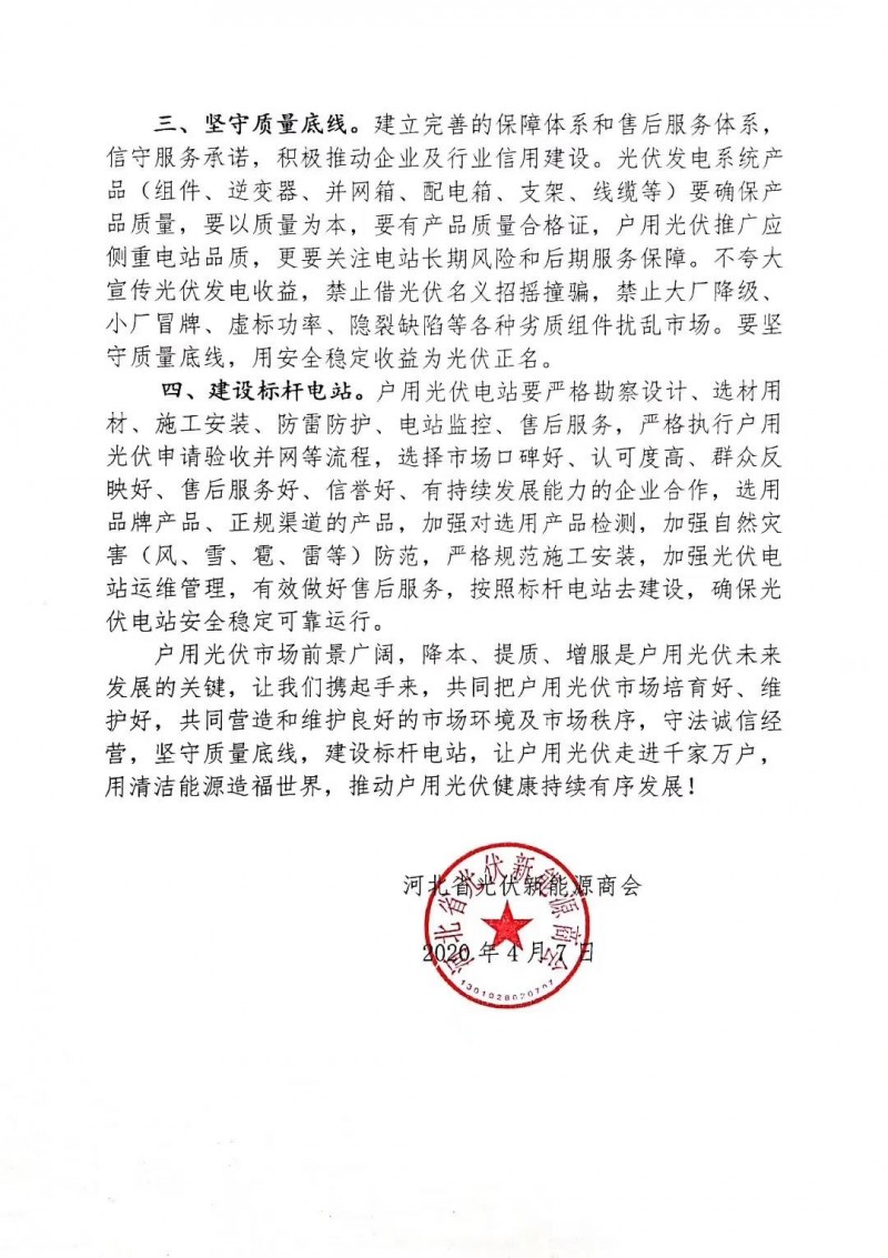 三、堅(jiān)守質(zhì)量底線。建立完善的保障體系和售后服務(wù)體系,信守服務(wù)承諾,積極推動(dòng)企業(yè)及行業(yè)信用建設(shè)。光伏發(fā)電系統(tǒng)產(chǎn)品(組件、逆變器、并網(wǎng)箱、配電箱、支架、線纜等)要確保產(chǎn)品質(zhì)量,要以質(zhì)量為本,要有產(chǎn)品質(zhì)量合格證,戶用光伏推廣應(yīng)側(cè)重電站品質(zhì),更要關(guān)注電站長期風(fēng)險(xiǎn)和后期服務(wù)保障。不夸大宣傳光伏發(fā)電收益,禁止借光伏名義招搖撞騙,禁止大廠降級(jí)、小廠冒牌、虛標(biāo)功率、隱裂缺陷等各種劣質(zhì)組件擾亂市場。要堅(jiān)守質(zhì)量底線,用安全穩(wěn)定收益為光伏正名。