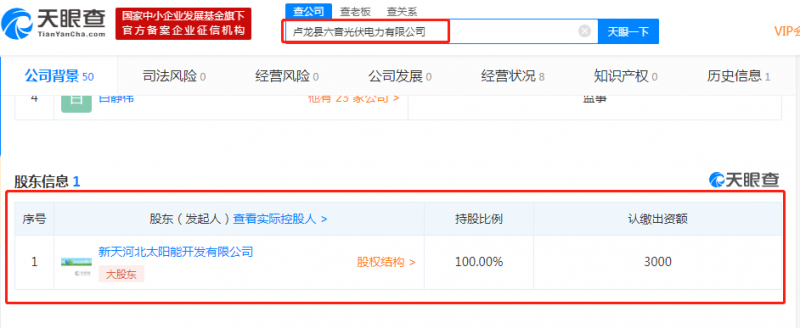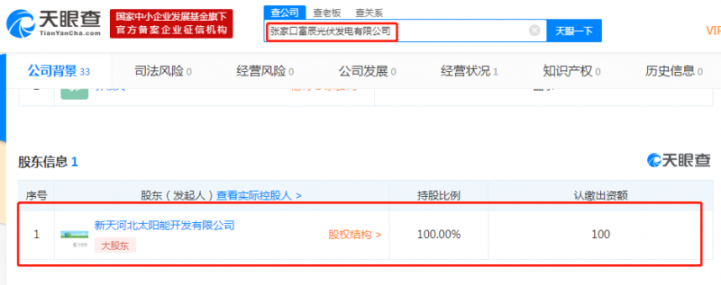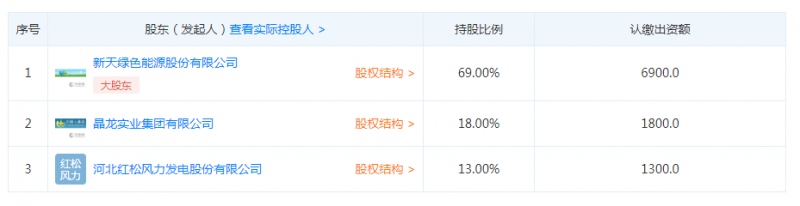 從天眼查獲悉,2014年4月24日,新天綠能聯(lián)合晶龍實業(yè)集團有限公司、河北紅松風力發(fā)電股份有限公司兩家企業(yè)共同設立新天河北太陽能開發(fā)有限公司,該公司主營業(yè)務為對太陽能等新能源項目的投資和太陽能設備銷售。其中,新天綠能持股比例69%,為第一大股東;晶龍實業(yè)集團持股比例18%,為第二大股東;河北紅松風力發(fā)電股份有限公司持股比例13%,為第三大股東。