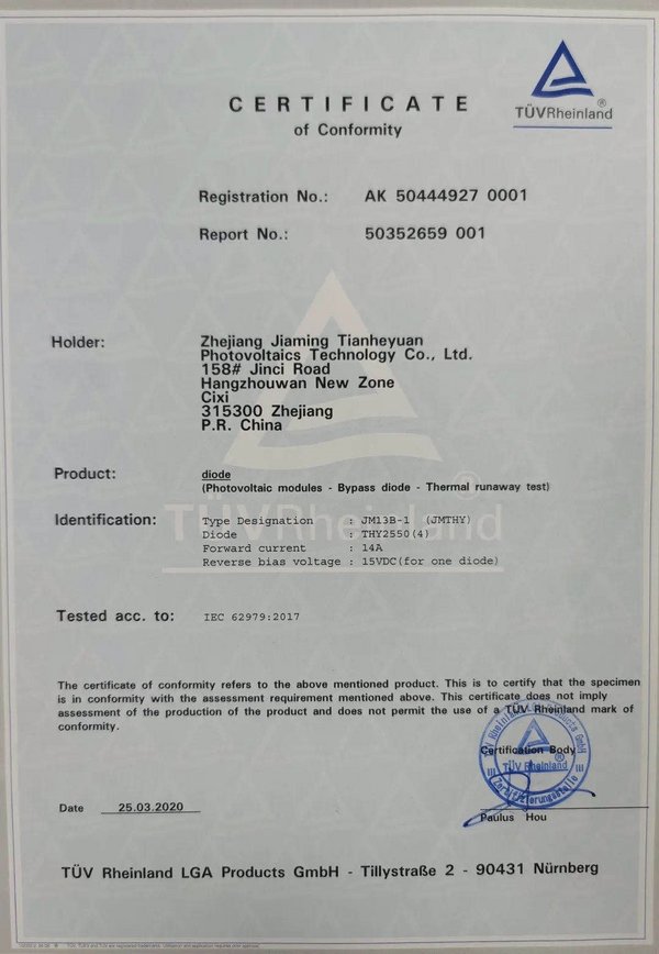 佳明天和緣副總經(jīng)理王福安表示:“公司致力于太陽能組件用接線盒、連接器及線纜的研發(fā)和制造,為客戶提供優(yōu)質(zhì)的產(chǎn)品和服務(wù)。此次通過TUV萊茵的二極管熱逃逸認(rèn)證測(cè)試,證明了該款產(chǎn)品的質(zhì)量穩(wěn)定可靠。未來,希望我們雙方繼續(xù)加強(qiáng)合作,共同推進(jìn)太陽能光伏行業(yè)的健康穩(wěn)定發(fā)展。”