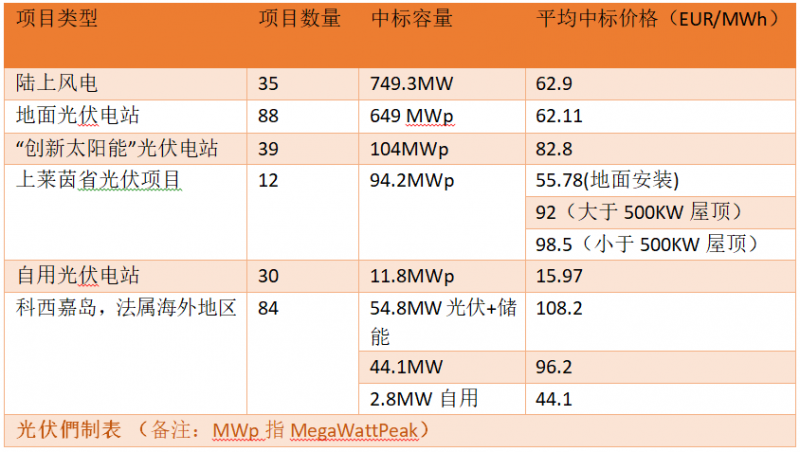 在法屬海外地區(qū)和科西嘉島的招標(biāo)中,劃分了84個光伏項目,總裝機容量達101.7MW。其中包括38個“太陽能+儲能”新項目,共計54.8MW,均價為108.20歐元/MWh;37個純光伏新項目,總裝機容量44.1MW,平均價為96.20歐元/MWh;另一個9個自用項目的平均股權(quán)溢價為44.10歐元/MWh。