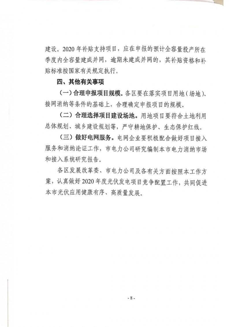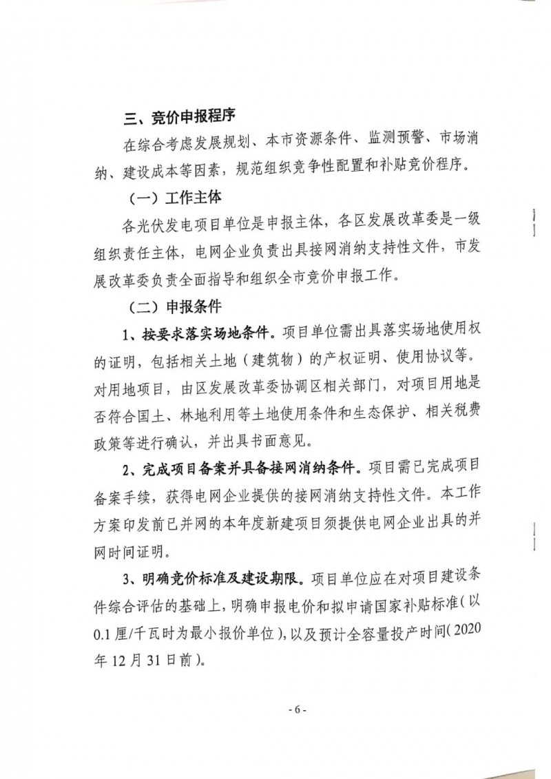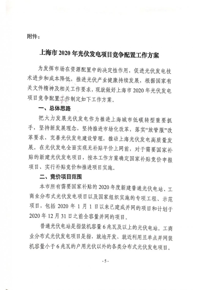 上海市所有需要國家補貼的2020年度新建普通光伏電站、工商業(yè)分布式光伏發(fā)電項目以及國家組織實施的專項工程、示范項目,包括2020年1月1日以來已建成并網(wǎng)的項目和計劃于2020年12月31日之前全容量并網(wǎng)的項目均可以參與競價。