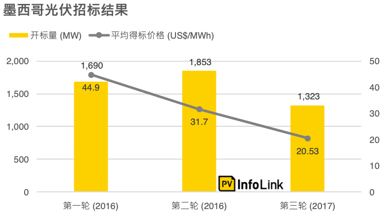 墨西哥在能源轉(zhuǎn)型法出臺后開始大力推動再生能源發(fā)展,其中光伏是重點(diǎn)的發(fā)展項(xiàng)目之一。墨西哥政府借由競標(biāo)的方式推動市場需求,在當(dāng)?shù)毓?yīng)鏈未臻完善的情況下,也讓海外業(yè)者有了新的開發(fā)空間爭相進(jìn)入墨西哥獲取市占,截至目前為止共舉辦了三輪的競標(biāo),且多半已在2020年前完工并網(wǎng)。而第四輪的競標(biāo)項(xiàng)目已取消,未來是否會重啟招標(biāo)仍尚待觀察評估,目前大型項(xiàng)目已開始轉(zhuǎn)往簽訂私人PPA的方式進(jìn)行,其成效尚待時(shí)間檢驗(yàn)。