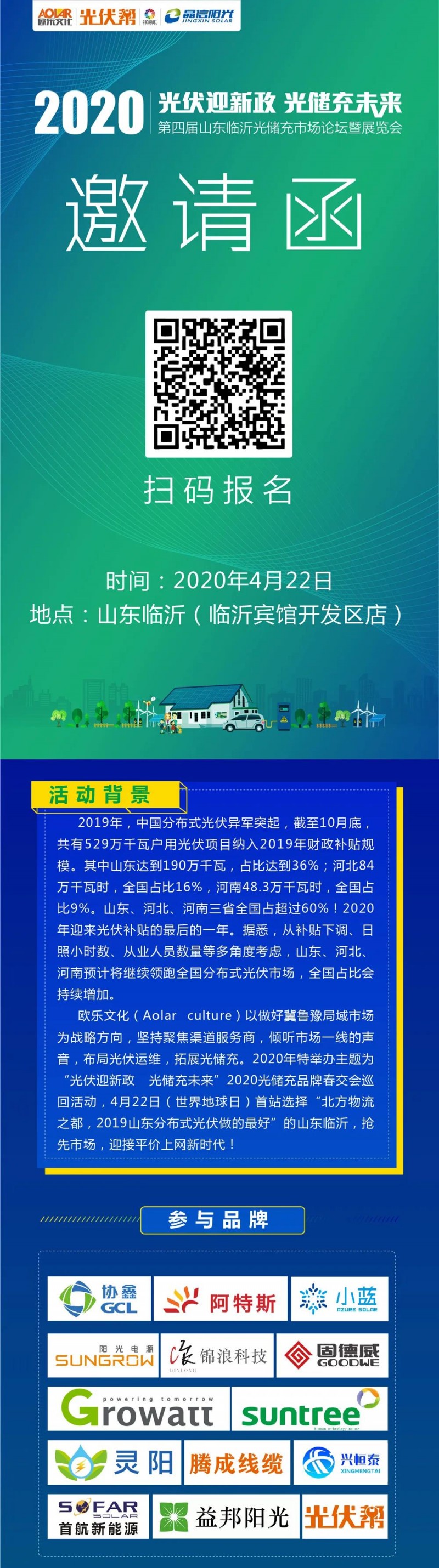 主題為“光伏迎新政 光儲充未來”,2020第四屆山東臨沂光儲充市場論壇暨展覽會4月22日(世界地球日)在“北方物流之都,2019山東分布式光伏做的最好”的山東臨沂召開,搶先市場,迎接平價上網(wǎng)新時代!