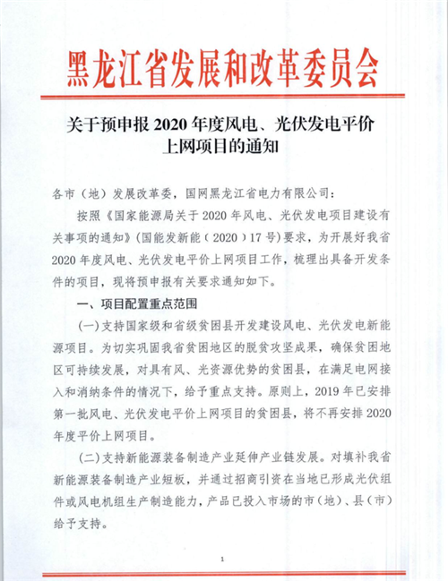 4月21日,黑龍江發(fā)改委印發(fā)《關于預申報2020年度風電、光伏發(fā)電平價上網(wǎng)項目的通知》,就2020年風、光平價項目申報的有關注意事項指出相關要求。