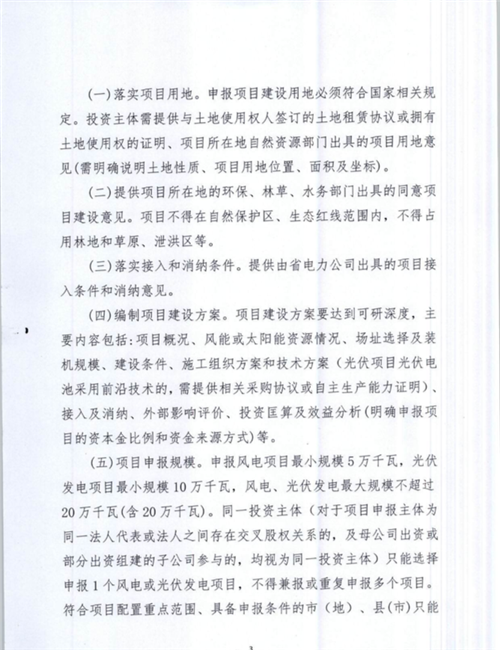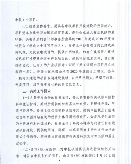 通知要求,風電項目最低申報規(guī)模不得低于50MW,光伏不得低于100MW,最大規(guī)模不得超過200MW。同一投資主體只能申報1個風電場或光伏項目,投資主體須在2020年底前開工,支持存量項目轉平價,報送截止日期為4月30日。