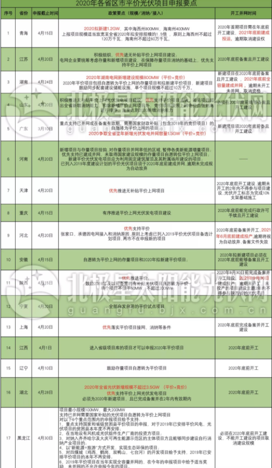 時(shí)間進(jìn)入4月下旬,截至目前,青海、江蘇、湖南、山東等17個(gè)省區(qū)市已相繼下發(fā)平價(jià)項(xiàng)目申報(bào)政策,最晚申報(bào)日前為4月30日(黑龍江)。剩余一周時(shí)間,2020年光伏平價(jià)項(xiàng)目申報(bào)即將收官。