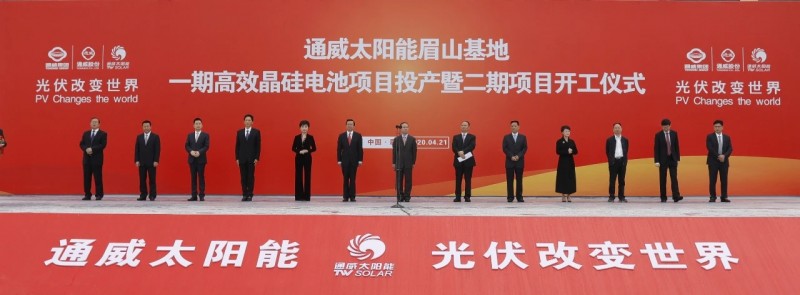 2020年4月21日,通威眉山一期高效太陽能電池項目正式建成投產,四川省人民政府副省長李云澤,省經濟和信息化廳二級巡視員肖世同,甘孜州委書記劉成鳴,州委副書記、州政府州長肖友才,州政府副州長杜德清,眉山市委書記慕新海,市委副書記、市政府代理市長胡元坤,市委副書記、天府新區(qū)眉山黨工委書記黃劍東,市委常委、市委秘書長汪樹槐,市政府副市長冉登祥等領導出席。十一屆全國政協(xié)常委、全國人大代表、通威集團董事局主席劉漢元,通威集團董事長管亞梅,通威集團總裁禚玉嬌,通威集團黨委書記、通威股份董事長謝毅,通威股份副董事長嚴虎,通威集團副總裁管亞偉等出席儀式。