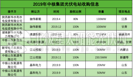 2019年,中核集團(tuán)旗下公司還通過(guò)電站交易,分別從珈偉新能、清源股份、順風(fēng)清潔能源、江山控股、晶科電力5家企業(yè)分別接手了230MW、77.1MW、490MW、280.5MW、70MW光伏電站,總?cè)萘?.13GW。