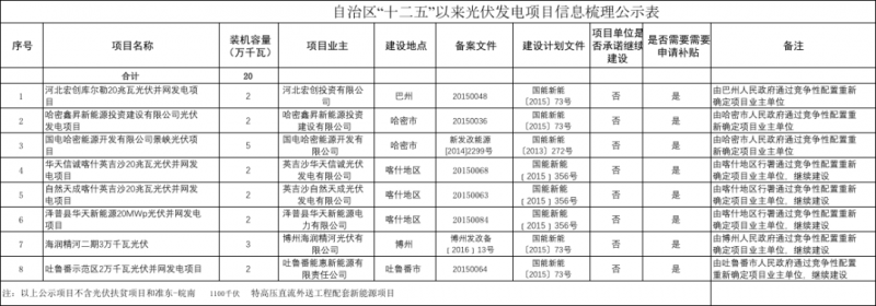 文件表示,根據(jù)《“十二五”以來(lái)新疆維吾爾族自治區(qū)風(fēng)電和光伏發(fā)電項(xiàng)目有關(guān)情況公示》要求,按照競(jìng)爭(zhēng)性配置重新確定項(xiàng)目業(yè)主的項(xiàng)目,各地市要重新通過(guò)競(jìng)爭(zhēng)性配置方案確定業(yè)主,需要重新配置業(yè)主的光伏電站規(guī)模為20萬(wàn)千瓦,項(xiàng)目名單如下。