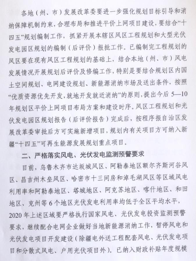 此外,文件還要求要積極組織新能源企業(yè)參與電力市場(chǎng)化交易和儲(chǔ)能設(shè)施建設(shè),繼續(xù)推進(jìn)南疆光伏儲(chǔ)能和新能源匯集站集中式儲(chǔ)能試點(diǎn)項(xiàng)目的建設(shè);對(duì)于有困難的新能源企業(yè)要做好減負(fù)脫困工作,支持有實(shí)力的新能源企業(yè)兼并重組,解決因補(bǔ)貼發(fā)放遲緩而導(dǎo)致企業(yè)經(jīng)營(yíng)困難的問(wèn)題;各州市要結(jié)合“十四五”規(guī)劃編制,抓緊開(kāi)展大型光伏發(fā)電園區(qū)的規(guī)劃報(bào)批工作,經(jīng)發(fā)改委審核后的新增項(xiàng)目方可納入新疆“十四五”可再生能源發(fā)展規(guī)劃重點(diǎn)項(xiàng)目。