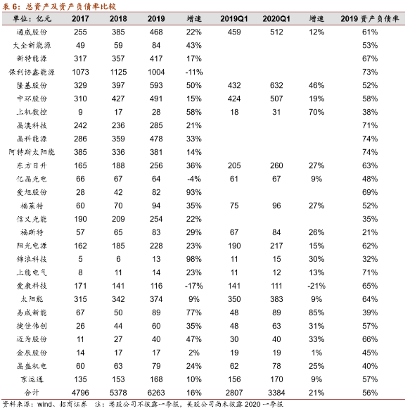 平均資產(chǎn)負(fù)債率56%。2019年光伏上市公司平均資產(chǎn)負(fù)債率56%,美股上市和剛A股上市的企業(yè)整體偏高,晶科和阿特斯負(fù)債率最高,達(dá)到74%,其次港股上市的保利協(xié)鑫73%,剛剛登陸A股的晶澳科技71%、上能電氣71%、愛旭股份69%,均處于較高水平,晶澳和愛旭定增之后資產(chǎn)負(fù)債率有望回落。