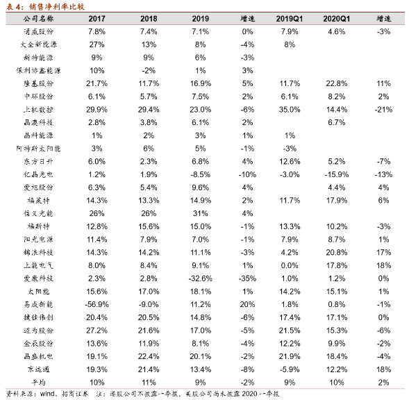 2019年全行業(yè)平均銷售凈利率9%。2019年27家上市公司算數(shù)平均銷售凈利率9%,同比下降2PCT。2020年Q1已披露數(shù)據(jù)的21家上市公司算術(shù)平均銷售凈利率10%,同比增長(zhǎng)1PCT。不同環(huán)節(jié)不同企業(yè)之間差別較大,全行業(yè)盈利能力最強(qiáng)的是信義的玻璃、隆基的硅片、晶盛的爐子、通威的硅料。
