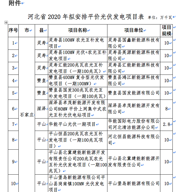 附件:河北省2020年擬安排平價光伏發(fā)電項目表