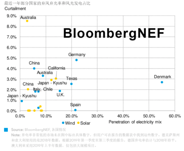 圖表:最近一年部分國家的棄風棄光率和風光發(fā)電占比(來源:彭博新能源財經)