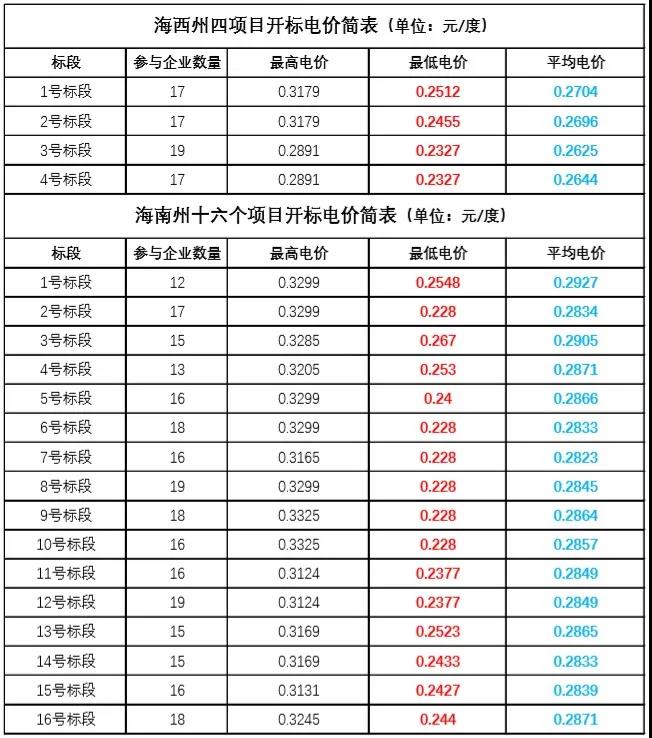 縱觀海西州、海南州二十個競價項目的報價可以發(fā)現(xiàn),海西州四個標(biāo)段的平均報價在0.2625-0.2704元/度,其中單個標(biāo)段的最低價格為0.2327元/度。海南州16個標(biāo)段的平價報價在0.2823~0.2927元/度,最低投標(biāo)電價為0.228元/度。而青海以0.2277元/度的水電交易價格作為基準(zhǔn)價計算補(bǔ)貼,也就是說0.228元/度的投標(biāo)電價幾乎等于基準(zhǔn)電價,兩者之間僅有0.0003元/度的差距。