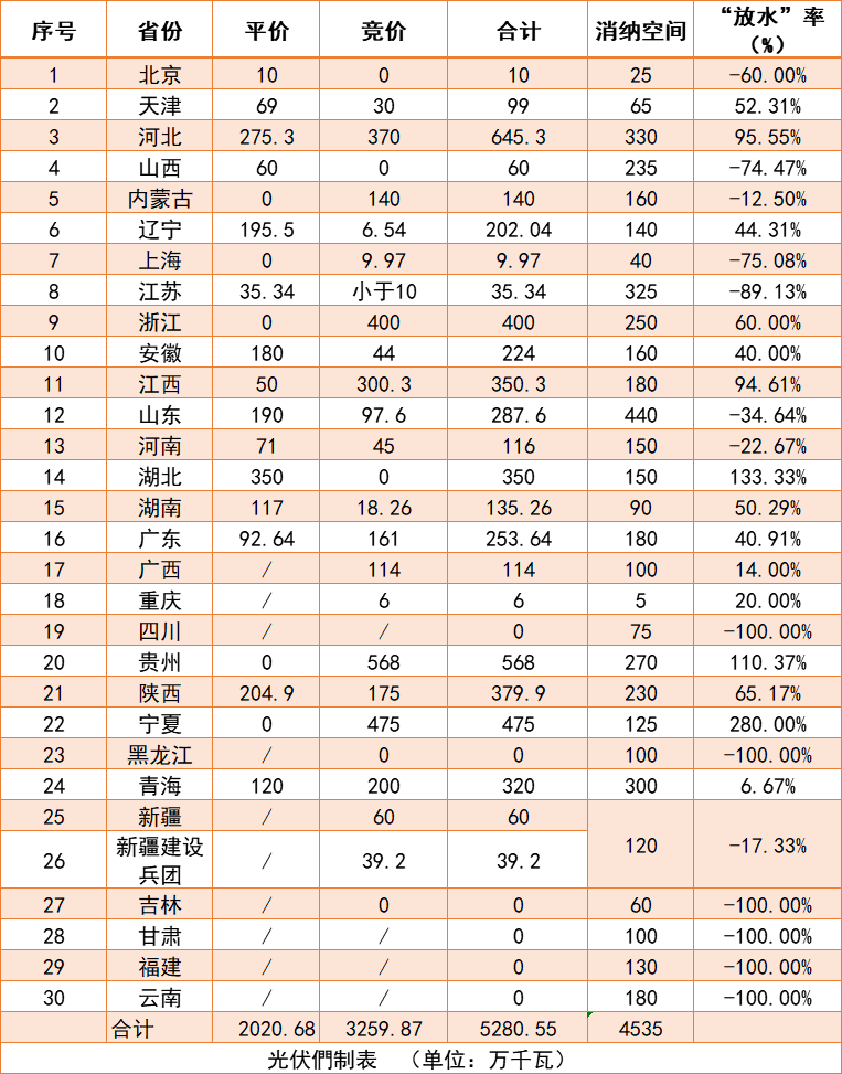 從上表數(shù)據(jù)可以看出,河北、江西、寧夏等省份的競價(jià)規(guī)模遠(yuǎn)超電網(wǎng)公司給出的2020年新增光伏消納空間。