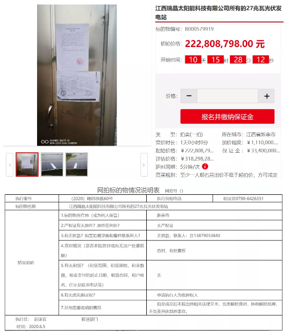 據(jù)世紀(jì)新能源網(wǎng)了解,該標(biāo)的物為江西瑞晶太陽能科技有限公司所有,當(dāng)事人議價(jià)為31829.8282萬元,而起拍價(jià)則為22280.8798萬元,按照起拍價(jià)計(jì)算相當(dāng)于8.25元/W。該標(biāo)的物將于2020年6月25日10時至2020年6月26日10時止開始拍賣。