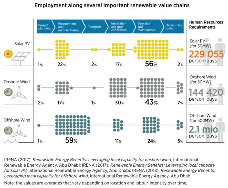 500兆瓦的海上風(fēng)電總共需要投入210萬工日,其中1%用于項(xiàng)目的前期規(guī)劃, 59%采購、制造、運(yùn)輸, 11%用于系統(tǒng)安裝和并網(wǎng),24%用于系統(tǒng)的運(yùn)營和維護(hù), 5%用于系統(tǒng)退役拆除。