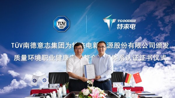 TUV南德北亞區(qū)管理服務部高級副總裁孫建軍先生、TUV南德大中華集團管理服務部總監(jiān)汪微波先生、特來電總裁郭永光先生、特來電高級副總裁陳忠強先生和首席科學家穆曉鵬先生及其團隊出席了此次頒證儀式。汪微波先生為特來電頒發(fā)了認證證書,孫建軍先生受邀致詞,對特來電在全球新能源汽車充電領域做出的貢獻表示高度贊許。郭永光先生表示TUV南德對特來電管理體系展開的審核認證,為特來電提供了質(zhì)量、環(huán)境及職業(yè)健康安全等體系最新相關信息與技術支持。TUV南德對特來電的市場前瞻性、創(chuàng)新的商業(yè)模式、具有合伙人思維和世界領先的充電技術、以及銳意進取和勇于承擔社會責任的精神給予稱贊。