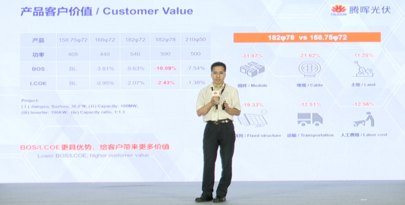 雖然有人說(shuō)安裝組件時(shí)需要2個(gè)人,其實(shí),現(xiàn)在M6組件也需要2個(gè)人。“通過(guò)這款產(chǎn)品你會(huì)發(fā)現(xiàn),相比現(xiàn)有的166、210產(chǎn)品,我們的麒麟產(chǎn)品將大幅降低BOS成本,LCOE也有2.43%的降低。對(duì)于投資及電站安裝商都是好消息。”