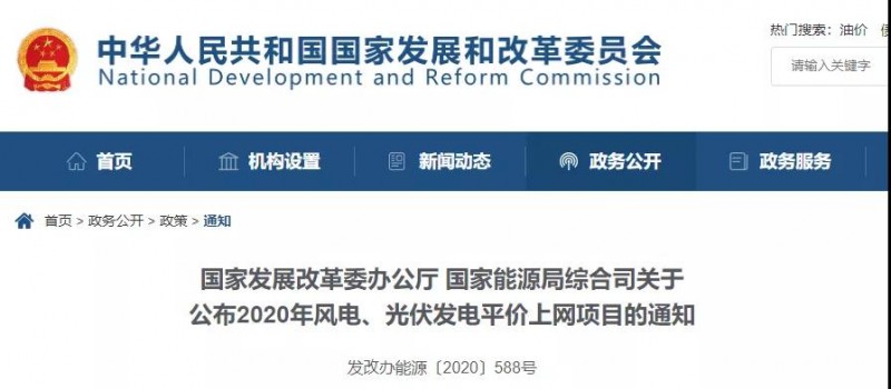 根據(jù)《國家發(fā)展改革委 國家能源局關于積極推進風電、光伏發(fā)電無補貼平價上網(wǎng)有關工作的通知》(發(fā)改能源〔2019〕19號)、《關于2020年風電、光伏發(fā)電項目建設有關事項的通知》(國能發(fā)新能〔2020〕17號)要求,結合各省級能源主管部門報送信息,2020年風電平價上網(wǎng)項目裝機規(guī)模1139.67萬千瓦、光伏發(fā)電平價上網(wǎng)項目裝機規(guī)模3305.06萬千瓦,現(xiàn)予公布。