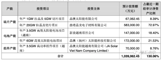 公司擬對(duì)公司一體化產(chǎn)能進(jìn)行擴(kuò)建,預(yù)計(jì)投資額103.91億元,分別對(duì)硅片、電池、組件等一體化產(chǎn)能進(jìn)行擴(kuò)建。