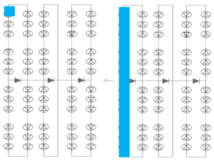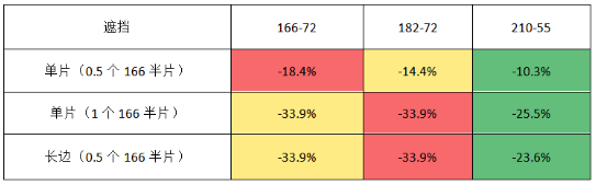 進(jìn)一步地,使用固定面積遮擋條件下,對(duì)比不同組件的功率變化率。以166半片面積 (137.08 cm2) 作為基準(zhǔn), 至尊二代組件由于使用G12大尺寸硅片及創(chuàng)新的版型設(shè)計(jì),陰影遮擋下功率損失更小,至尊二代組件在局部遮擋發(fā)生時(shí),具備突出的功率保持率。其中,遮擋條件示意圖如圖2。顯然,210產(chǎn)品有利于減少遮擋帶來(lái)的影響,發(fā)電效率更高。