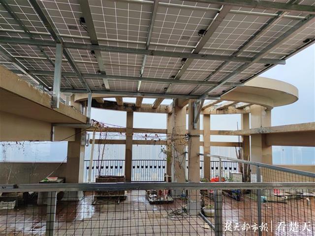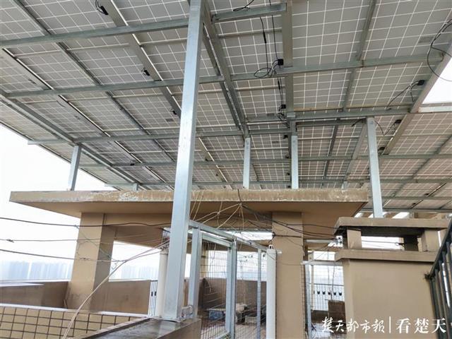 21日上午,楚天都市報記者在該小區(qū)1棟2單元樓頂天臺看到,光伏發(fā)電站的面板安裝天臺上,用鋼架結(jié)構(gòu)固定,就像給天臺加蓋了頂棚,電站區(qū)域還用鐵絲網(wǎng)圈圍起來。