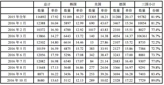 表 2016年全年中國多晶硅進口情況(單位:噸、美元/千克)