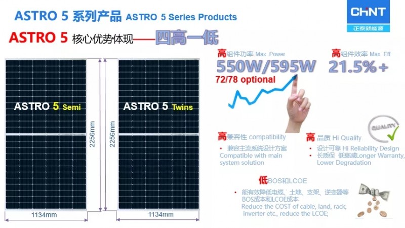 正泰新能源晶硅制造事業(yè)部產(chǎn)品管理胡豐華詳細(xì)分享正泰組件的可靠性控制。光伏行業(yè)的技術(shù)進(jìn)步以及市場(chǎng)對(duì)高效太陽(yáng)能電池、組件的追求不斷推動(dòng)產(chǎn)業(yè)快速發(fā)展,高效電池、高功率組件、高可靠度、高速智能制造、綠色光伏等已是行業(yè)趨勢(shì),在組件技術(shù)上,大尺寸硅片已成熱點(diǎn)。十余年來(lái),正泰新能源持續(xù)鉆研光伏前沿技術(shù),歷經(jīng)數(shù)代技術(shù)更迭,2020年推出全新ASTRO5系列組件,運(yùn)用大尺寸硅片、半片、MBB等高效技術(shù)造就高功率、高效率、高兼容性、高品質(zhì)、低BOS和LCOE的核心優(yōu)勢(shì),ASTRO5系列72版型功率最高可達(dá)550W,78版型功率最高可達(dá)595W。