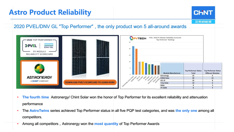 正泰新能源光伏組件擁有ISO各類體系認(rèn)證,組件性能得到TUV、CTC、CSA等多家光伏行業(yè)第三方機(jī)構(gòu)驗(yàn)證認(rèn)可。經(jīng)CTC海南戶外實(shí)證(濕熱氣候)及TUV北德寧夏戶外實(shí)證(干熱氣候),衰減率成績(jī)亮眼,加之全面升級(jí)質(zhì)保等,組件性能具有高可靠性。憑借ASTRO系列組件出色的高可靠性和低衰減性,正泰新能源四次榮獲PVEL/DNVGL“Top Performer”頂級(jí)組件制造商榮譽(yù)。其中,Astro Twins雙面系列組件在每項(xiàng)PQP測(cè)試序列中均獲得Top Performer,是所有參賽者中僅有的一位5項(xiàng)全能大滿貫“選手”,竭誠(chéng)兌現(xiàn)了正泰ASTRO系列組件“締造持久高效綠色能量”的價(jià)值主張。