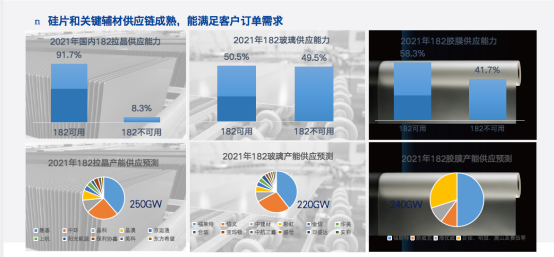 此外,在生產(chǎn)制造方面,得益于182產(chǎn)品配套的成熟,日前組件已經(jīng)逐步進入量產(chǎn)階段。“182拉晶與158產(chǎn)品成晶率基本持平,后續(xù)還有一定提升空間,切片環(huán)節(jié)良率雖略低但很快將與158硅片達到持平狀態(tài),電池效率通過各環(huán)節(jié)優(yōu)化工藝可以提升至23.1%。目前組件量產(chǎn)效率已達到21%以上,運輸方面與158/166產(chǎn)品相比較,每個集裝箱可以多裝10%~20%瓦左右”,晶澳高級副總裁助理資深產(chǎn)品技術專家王夢松強調,更重要的是,182產(chǎn)品在拉晶、切片、電池、組件方面每道工序都有多個合格的供應商。預計2021年可供應182產(chǎn)品的拉晶、玻璃、膠膜產(chǎn)能“都在50%以上,拉晶占比更是高達91.7%。