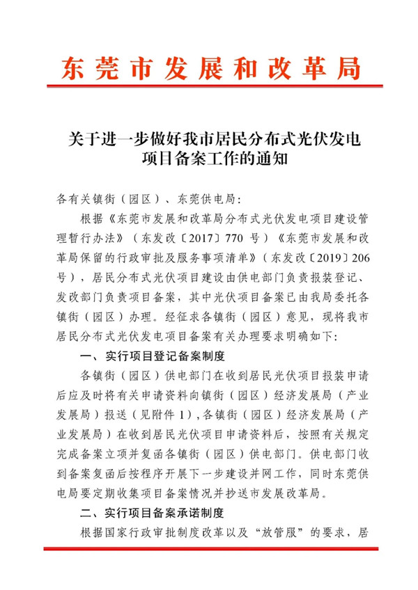 廣東東莞市發(fā)布《關(guān)于進(jìn)一步做好我市居民分布式光伏發(fā)電項(xiàng)目備案工作的通知》